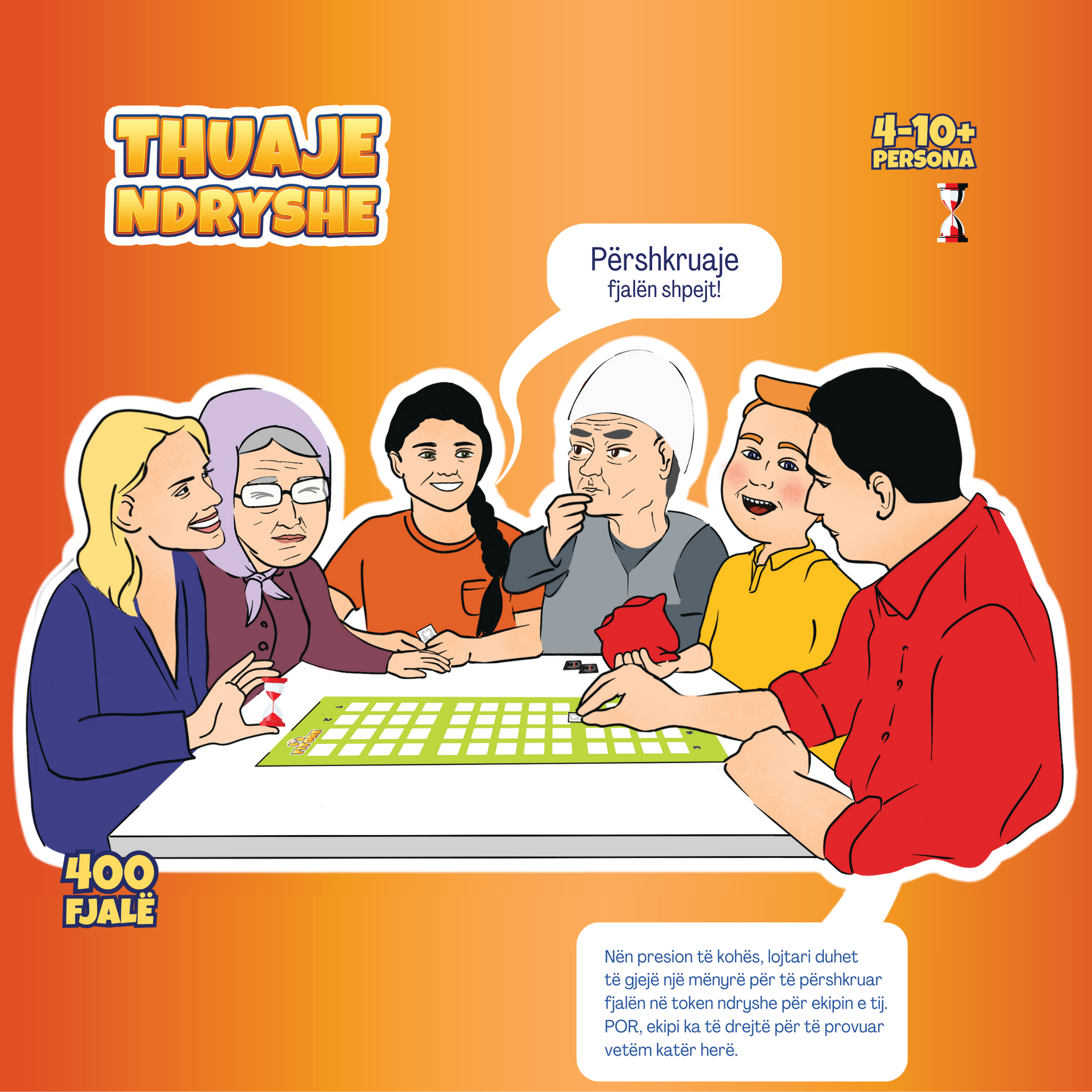 Ett snabbt och lekfullt sällskapsspel där ord, tempo och mod står i fokus – på albanska.